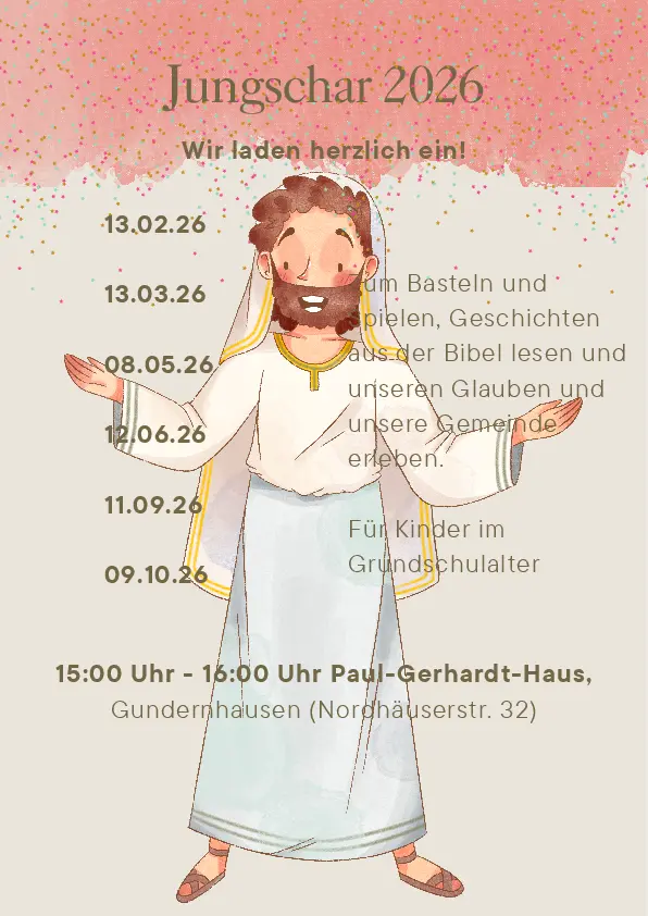 Die Jungschar ist eine Kindergruppe der "Evangelischen Kirchengemeinde Roßdorf + Gundernhausen“. Wir treffen uns am zweiten Freitag im Monat im Paul-Gerhardt-Haus, in der Nordhäuser Straße 32 in Gundernhausen, von 15:00 Uhr bis 16:00 Uhr. Wir spielen und basteln gemeinsam, lesen Geschichten aus der Bibel und entdecken unseren Glauben und unsere Gemeinde. Alle Kinder im Grundschulalter sind herzlich eingeladen vorbeizukommen, wir freuen uns über jeden und jede von euch!