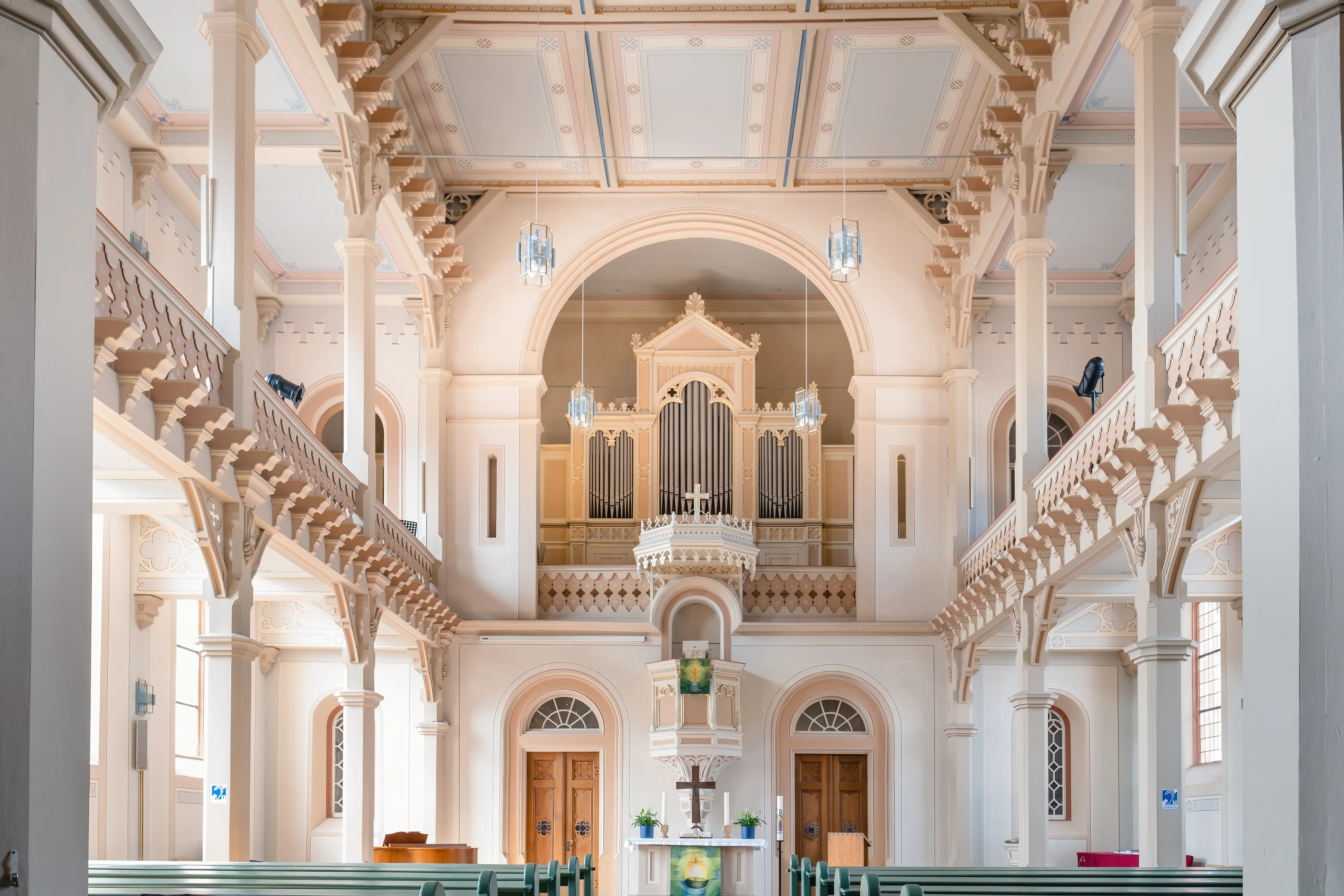 Im November 1860 wurde, für die damalige Zeit eine Seltenheit, eine Kirchenheizung eingebaut. Die bestand aus drei großen Porzellanöfen, welche mit Holz befeuert wurden. Diese wurden rechts und links der Kanzel und in der Sakristei aufgestellt. Das hatte zur Folge, dass beiderseits des Altars je drei Reihen Stühle entfernt werden mussten, welche für die Pfarrfamilie und den Kirchenvorstand sowie für die Lehrer und deren Angehörigen reserviert waren. Die Ofenheizung wurde erst vor einigen Jahren durch eine moderne Heizungsanlage ersetzt. Wesentliche Änderungen im Innenausbau der Kirche wurden seit 1860 nicht mehr vorgenommenen.